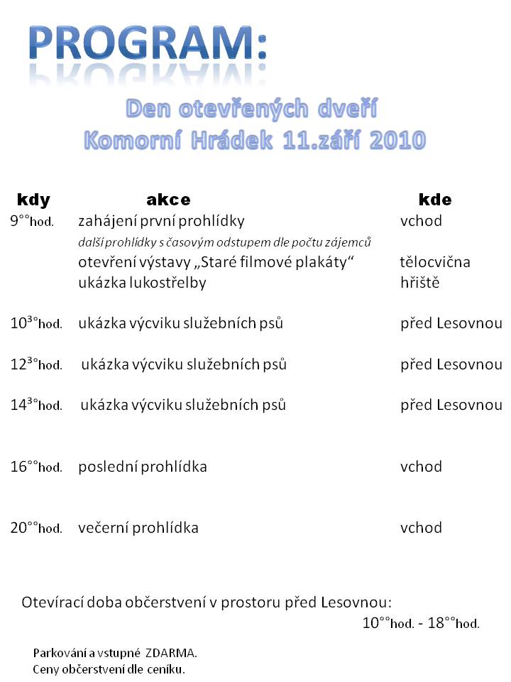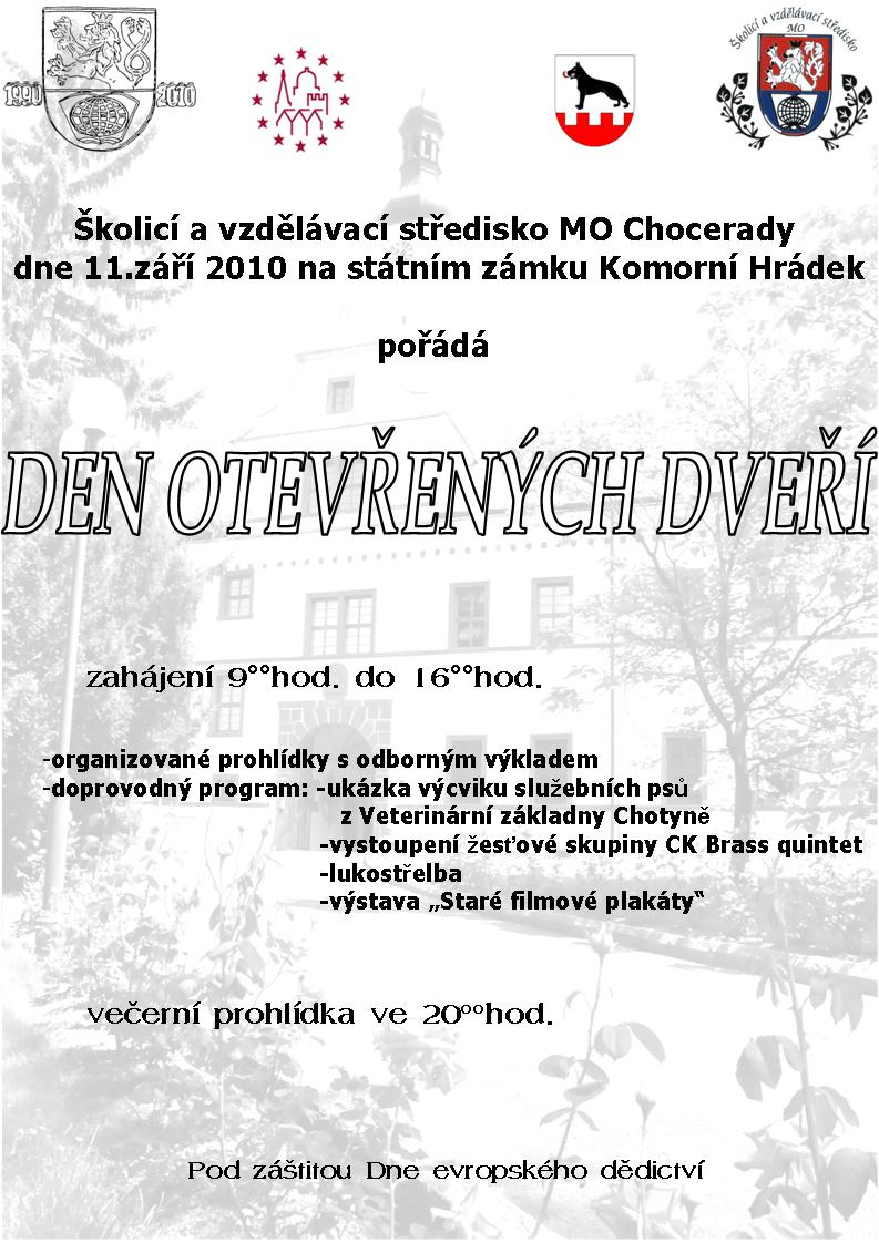 Všechny zájemce o historii a novodobé poslání zámku Komorní Hrádek zveme v sobotu 11. září 2010 k návštěvě tohoto zajímavého objektu, ve kterém v současné době sídlí Školicí a vzdělávací středisko Ministerstva obrany ČR.