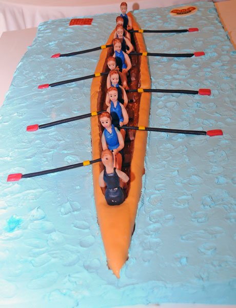 Při přátelském setkání předal primátor Bém veslařům dárek k 60. výročí armádního veslování dort ve tvaru osmiveslice.