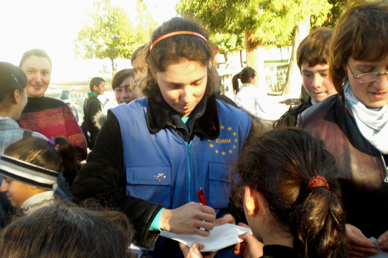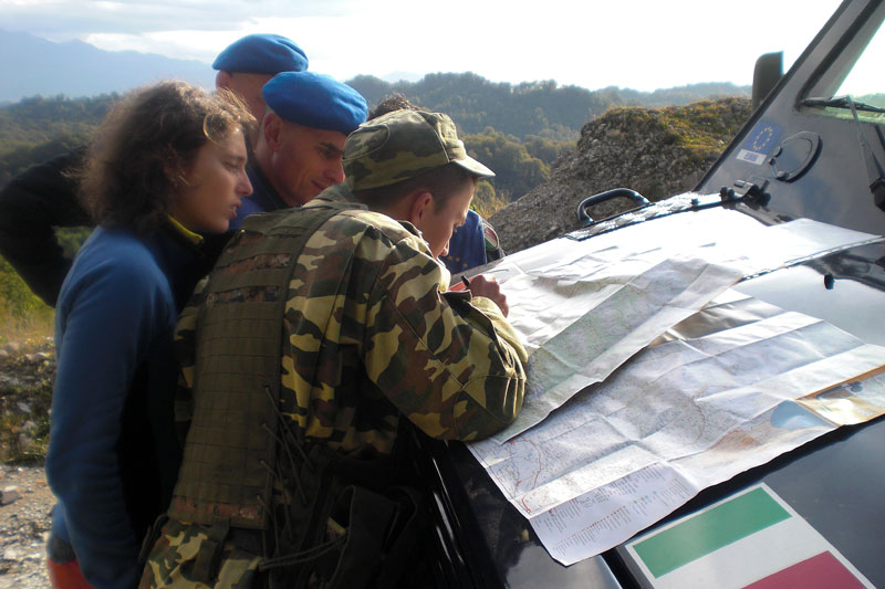 Tým v Zugdidi jako jediný v EUMM monitoruje situaci na administrativní hranici s Abcházií. Ostatní týmy se soustředily poblíž Jižní Osetie. Práci si pozorovatelé v Zugdidi dělí do tří pilířů, pracovně zvaných „vojenský“, „policejní“ a „humanitární“. Jitka Háková, devětadvacetiletá absolventka právnické fakulty, se v rámci humanitárního týmu věnovala především problematice lidských práv, svobody pohybu, situaci vnitřně vysídlených osob a dalším podobným oblastem. „Hodně kontaktů jsme navazovali s místními úřady, s ministerstvem pro ubytování a uprchlíky, úřadem ombudsmana, zástupci politických stran, s médii a nevládními organizacemi a samozřejmě přímo s místním obyvatelstvem. Zajímalo nás v podstatě všechno, od fungování právního a sociálního systému, přes probíhající humanitární projekty až po množství dřeva, které dostanou uprchlíci v zimě na topení. Zajímavé byly i návštěvy škol, nemocnic, kolektivních center a různých místních drobných podniků. Značnou část naší práce pak zaujímala otázka svobody pohybu přes administrativní hranici Gruzie -Abcházie.“