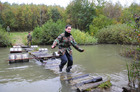 Ve stráni mírně se svažující od dlážděné silnice protínající výcvikový prostor jsou směrem k nevelké vodní ploše v řadě za sebou rozmístěny jednotlivé prvky bojové dráhy – bludiště, betonová stěna, příkop, lávka, skruže a další. Téměř padesátičlenná skupina mladých mužů a dívek převážně v maskáčích se právě seskupila kolem rohatek potažených ostnatým drátem. Vedoucí výcviku jim vysvětluje, jak vlastním tělem vytvořit můstek přes pichlavou překážku. Když se s rozvahou rozloží na drátěný rošt, klade nárt pravé nohy do podkolení jamky druhé dolní končetiny, aby tak vytvořil první schod. „Buďte ke svým kolegům ohleduplní, nepřecházejte je po špičkách, ale našlapujte na ně celými chodidly, abyste rozložili svou váhu na větší plochu,“ uděluje poslední rady a dává pokyn prvním dobrovolníkům, aby si vyzkoušeli roli živé lávky.
