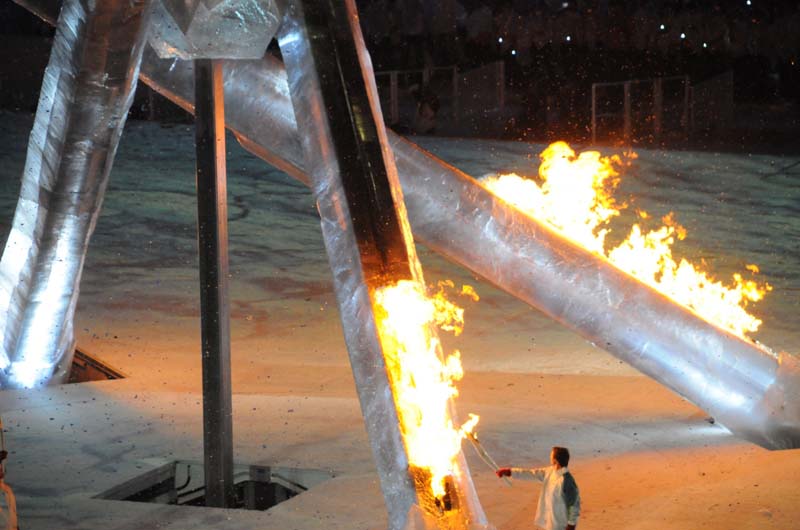 Na samotný závěr velkolepé slavnosti dorazil do haly i všemi očekávaný olympijský oheň, který přinesl poslední z běžců - hokejista Wayne Gretzky. Obří olympijskou pochodeň mu pak pomohli zapálit další kanadské sportovní legendy - rychlobruslařka Katrina LeMayová Doanová, basketbalista Steve Nash a paralympijský šampion Rick Hansen.