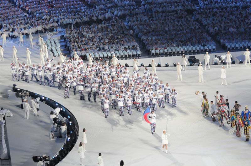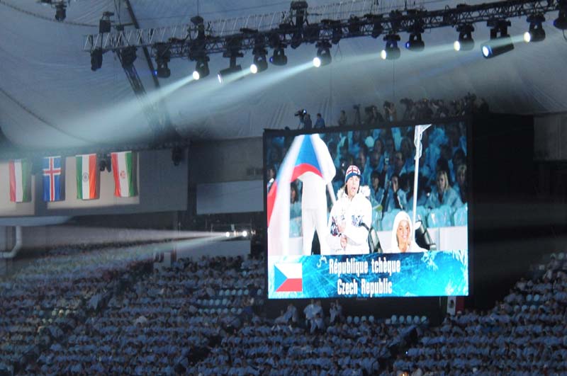 Promenádu olympioniků zahájila, jako již tradičně, výprava Řecka. Poslední se do připravených volných sedaček na jedné z tribun usadili za ohlušujícího řevu šedesáti tisíc diváků v hale s nafukovací střechou domácí reprezentanti. Obřím potleskem byla odměněna přítomnými gruzínská výprava, která byla zahalena do černé barvy. Největší českou výpravu v historii zimních her přivedl na plochu jako vlajkonoš hokejista Jaromír Jágr.