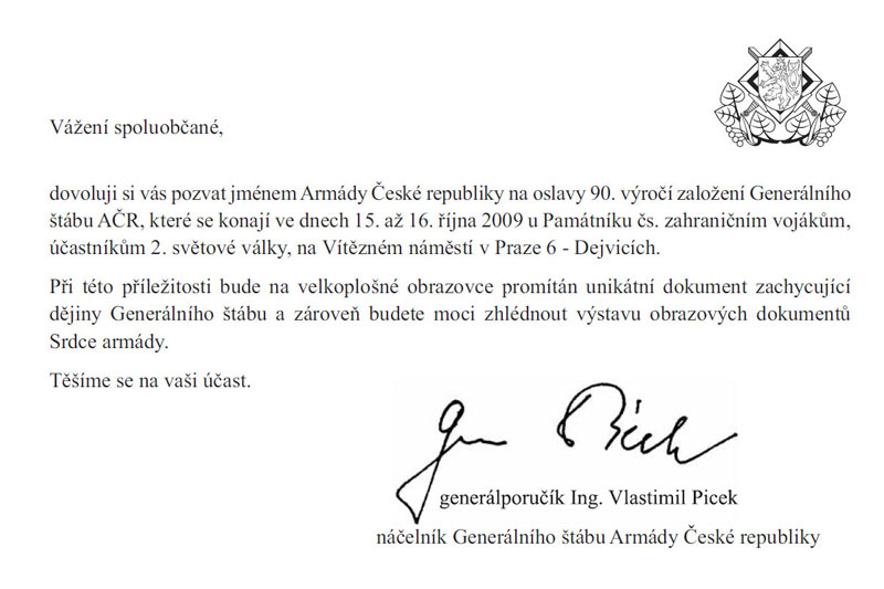 Pozvánka na oslavy 90. výročí Generálního štábu