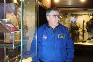 Stephen Bowen před vitrínou s horninou z Měsíce