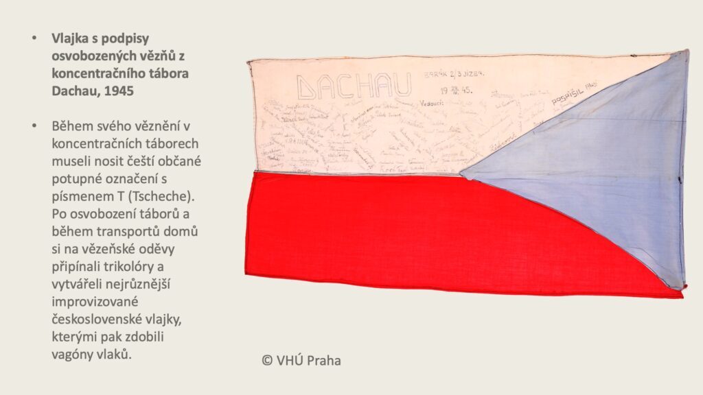 Vlajka s podpisy osvobozených vězňů z koncentračního tábora Dachau, 1945