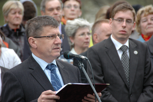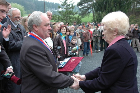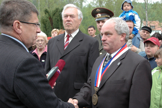 Náměstek ministra obrany František Padělek udílí Záslužný kříž ministra obrany ČR obci Javoříčko. Vyznamenání přebírá starosta obce Luká František Lakomý