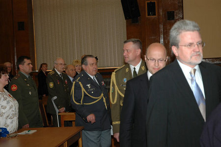 Příchod čestných hostů do sálu- zprava: Tomáš Kladávko, Tomáš Perutka, generál Miroslav Žižka,...