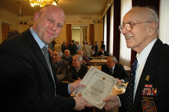 Starosta městské části Brno-střed Libor Šťástka při předání pamětního listu Josefu Novákovi