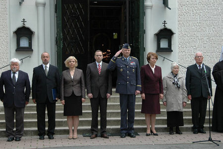 Čestní hosté pietního shromáždění před kostelíkem na Olšanských hřbitovech