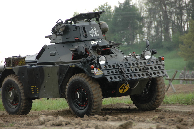 Britský obrněný transportér Ferret z 50. let, symbol lebky představuje znak pluku střežící Buckinghamský palác "Death or Glory"