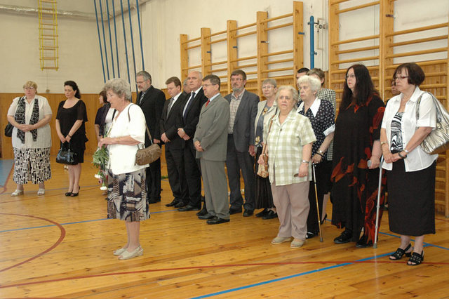 Peitní vzpomínka v tělocvičně kladenského gymnázia, kde byly položeny květiny na místa, kde stály matky se svými dětmi v roce 1942