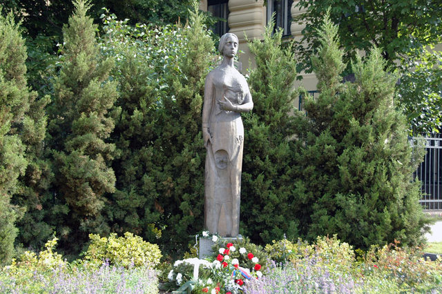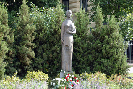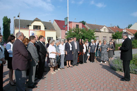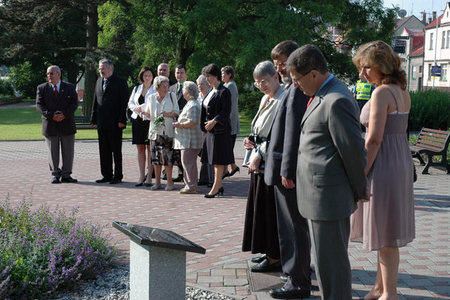 Náměstek ministra obrany František Padělek před pamětní deskou pomníku lidickým matkám