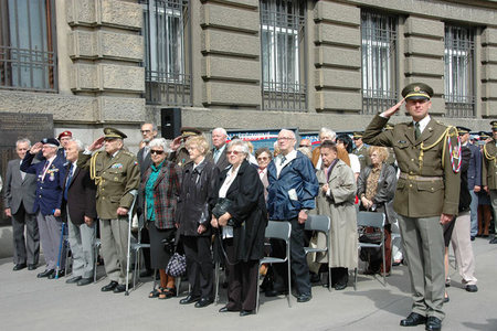Náměstek ministra obrany Jan Fulík se před budouvou Generálního štábu pozdravil s válečnými veterány