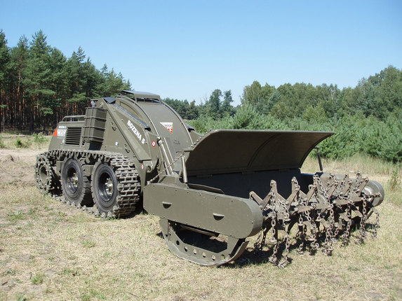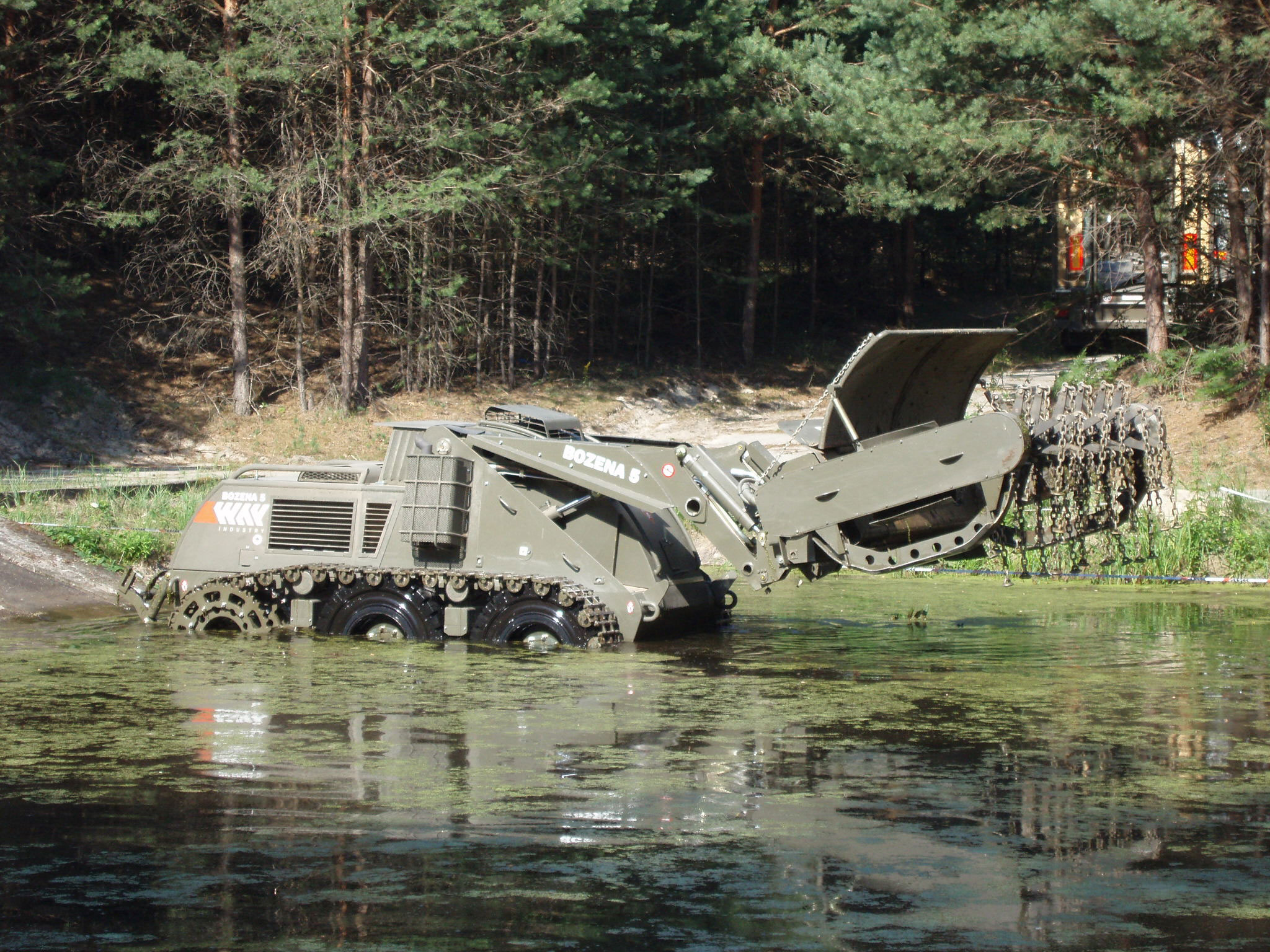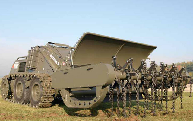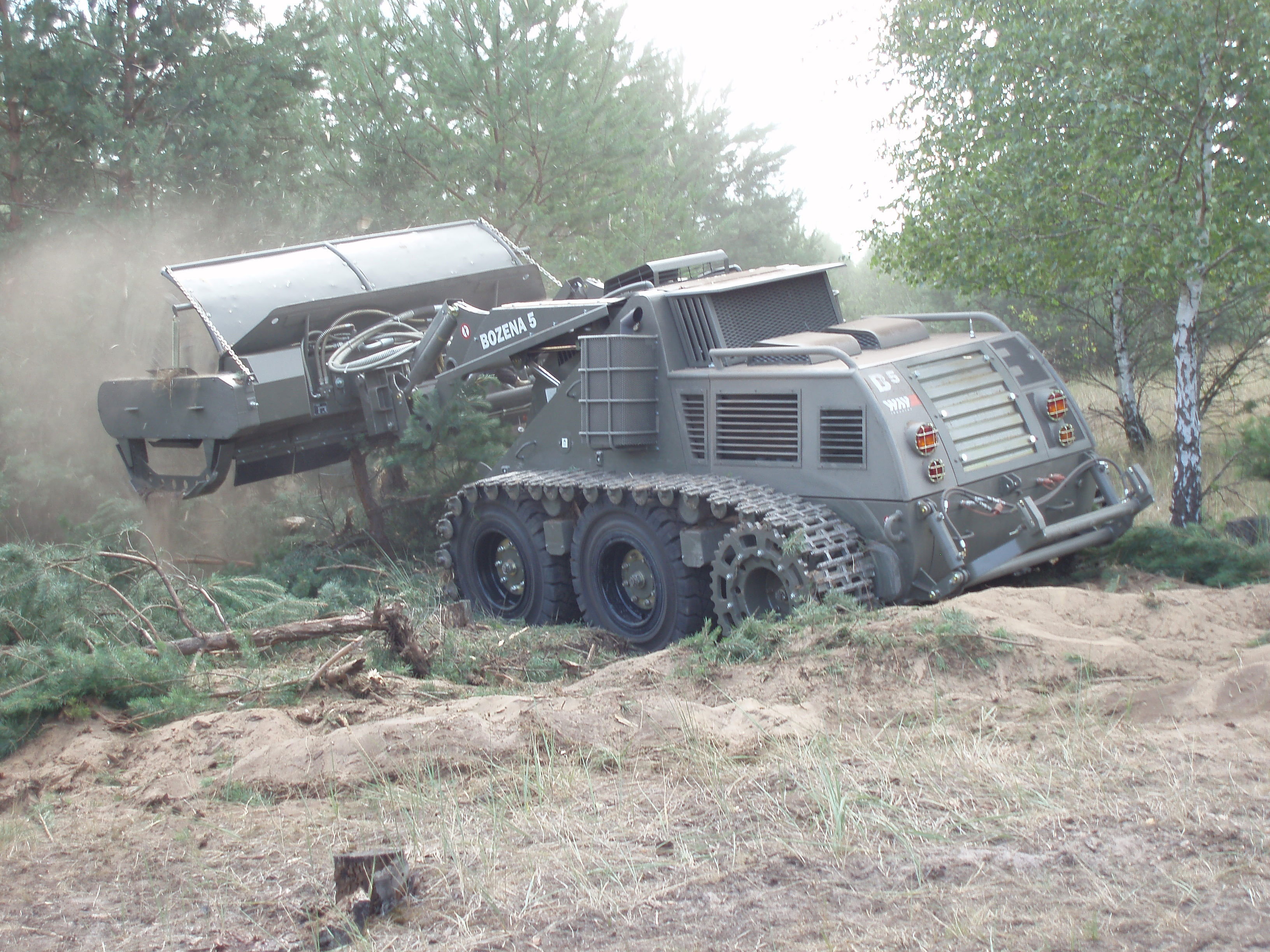 Komplet BOŽENA 5 je dálkově ovládaný samojízdný odminovací stroj určený k plošnému odminování terénu od protipěchotních i protitankových min.